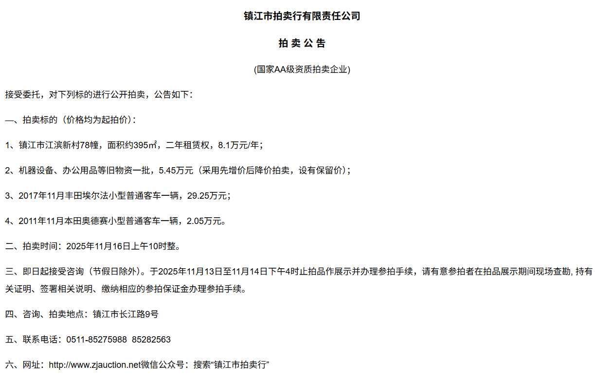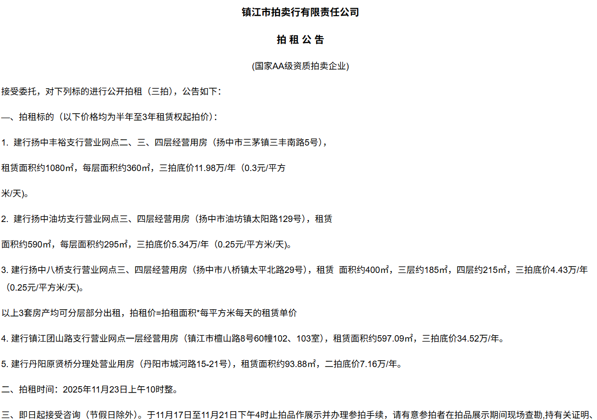 鎮江市拍賣行有限責任公司拍 租 公 吿(國家AA級資質拍賣企業)接受委托,對下列標的進行公開拍租(三拍),公告如下:—、拍租標的(以下價格均為半年至3年租賃權起拍價):1.  建行揚中豐裕支行營業網點二、三、四層經營用房(揚中市三茅鎮三豐南路5號),租賃面積約1080㎡,每層面積約360㎡,三拍底價11.98萬/年(0.3元/平方米/天)。2.  建行揚中油坊支行營業網點三、四層經營用房(揚中市油坊鎮太陽路129號),租賃面積約590㎡,每層面積約295㎡,三拍底價5.34萬/年(0.25元/平方米/天)。3. 建行揚中八橋支行營業網點三、四層經營用房(揚中市八橋鎮太平北路29號),租賃  面積約400㎡,三層約185㎡,四層約215㎡,三拍底價4.43萬/年(0.25元/平方米/天)。以上3套房產均可分層部分出租,拍租價=拍租面積*每平方米每天的租賃單價4. 建行鎮江團山路支行營業網點一層經營用房(鎮江市檀山路8號60幢102、103室),租賃面積約597.09㎡,三拍底價34.52萬/年。5. 建行丹陽原賢橋分理處營業用房(丹陽市城河路15-21號),租賃面積約93.88㎡,二拍底價7.16萬/年。二、拍租時間:2025年11月23日上午10時整。三、即日起接受咨詢(節假日除外)。于11月17日至11月21日下午4時止拍品作展示并辦理參拍手續,請有意參拍者在拍品展示期間現場查勘,持有關證明、簽署相關說明、繳納相應的參拍保證金辦理參拍手續。四、咨詢、拍租地點:鎮江市長江路9號五、聯系方式:0511-85275988   13655299933楊先生六、網址:http://www_zjauction_net.4xfab.com;微信公眾號:搜索“鎮江市拍賣行” 拍品清單2025.11.23序號名稱起拍價(元)標的說明1建行揚中豐裕支行營業網點二、三、四層經營用房(揚中市三茅鎮三豐南路5號),租賃面積約1080㎡,每層面積約360㎡三拍底價11.98萬/年(0.3元/平方米/天)1、1-3號房產均可分層部分出租,拍租價=拍租面積*每平方米每天的租賃單價;2、意向競拍人在拍賣前需持營業執照或身份證與委托方說明租賃房產經營業態,確定意向后出具房產承租用途承諾書,經委托方審核后,方可交納保證金參加競拍;3、租賃期限為半年至3年(承租方與出租方協商而定),承租方每半年或一年結付租金,租賃期間的水、電費用及其它相關費用均由承租方承擔;4、承租方不得用于經營和保管危險物品,不得用于開設餐飲、娛樂等可能嚴重影響消防安全、運營安全的經營業態,不得用于經營委托貸款、小額貸款等可能冒用委托方名義,帶來聲譽風險的經營業態。租賃期內,承租方不得破壞墻體結構,自行成就消防、安全等使用條件,不得擅自將租賃房屋轉租、轉讓給他人使用,否則委托方有權收回房屋;5、拍租成交后,承租方將租金交至出租方指定賬戶,傭金交至拍賣方賬戶(拍租傭金為該房屋一個月租金)。承租方憑租賃合同無息退還保證金。2建行揚中油坊支行營業網點三、四層經營用房(揚中市油坊鎮太陽路129號),租賃面積約590㎡,每層面積約295㎡三拍底價5.34萬/年(0.25元/平方米/天)3建行揚中八橋支行營業網點三、四層經營用房(揚中市八橋鎮太平北路29號),租賃面積約490㎡,每層面積約245㎡三拍底價4.43萬/年(0.25元/平方米/天)4建行鎮江團山路支行營業網點一層經營用房(鎮江市檀山路8號60幢102、103室),建筑面積約597.09㎡三拍底價34.52萬/年5建行丹陽原賢橋分理處營業用房(丹陽市城河路15-21號),建筑面積約93.88㎡二拍底價7.16萬/年