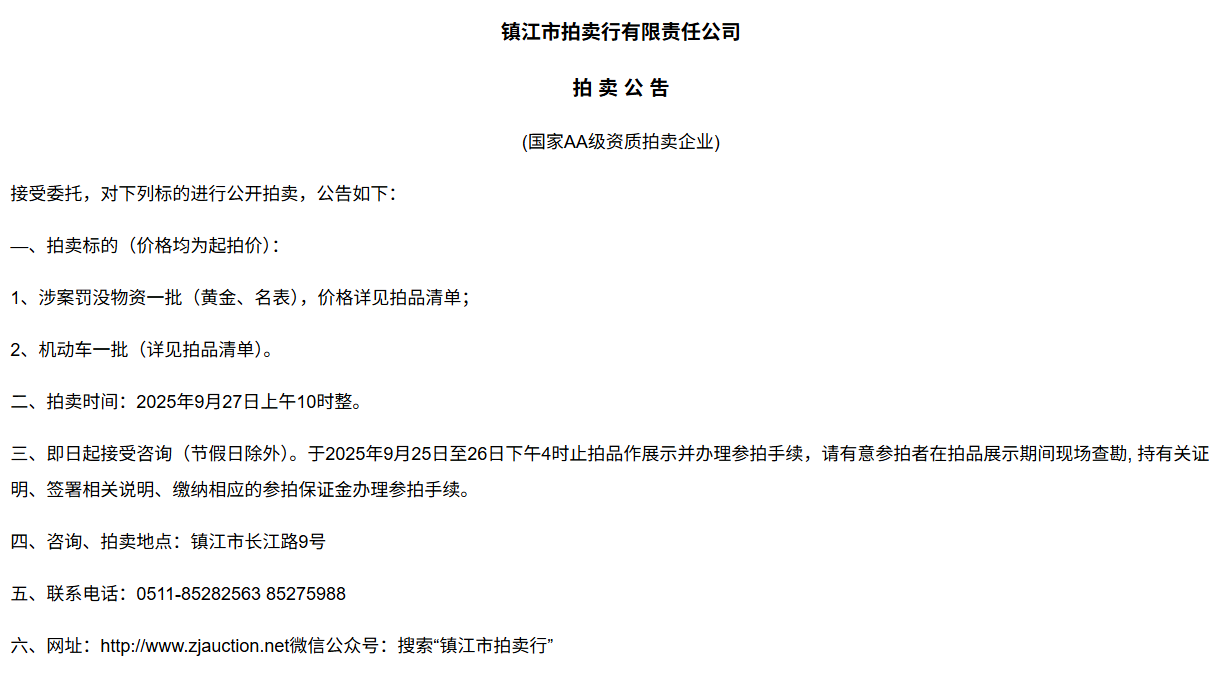 本公司受鎮江市公安局委托,對2025年度鎮江市市區摩托車上牌額度認購權進行拍賣,現將有關事項公告如下: